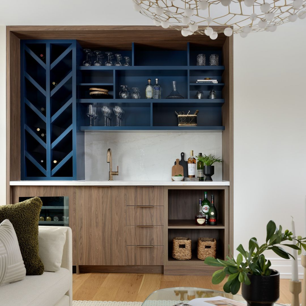 When the client told us that he had never had a bar in his home, but loved the idea of including one in the space, we knew exactly how we could incorporate that feature in the family room. Lower cabinets in the same walnut finish as the pantry doors provide ample storage, while a wine fridge and bright blue chevron shelving showcase an impressive collection of libations.