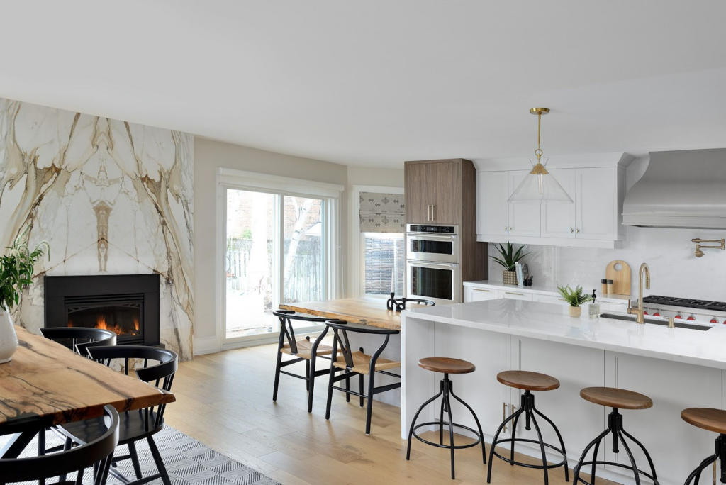 Off the kitchen, the open space flows into a stunning dining area where a floor-to-ceiling marble fireplace takes center stage. In front, an expansive, rustic table, made from the same Candaian maple tree as the kitchen peninsula, completes this inviting vignette.