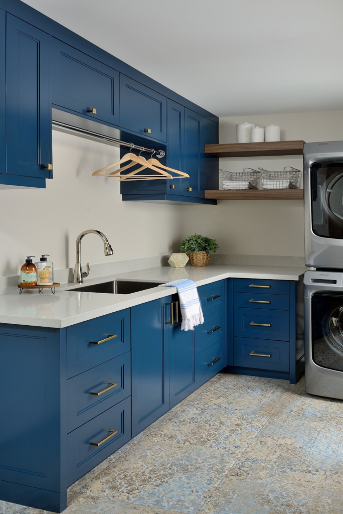 Finally, for a pop of color and whimsy, the new laundry room features Portuguese tin-glazed ceramic tiles that are sure to make our clients smile on laundry day. Bright blue cabinets allow for endless storage while a spacious counter is perfect for folding. A hanging rod was placed strategically over the sink for drying delicate garments. This room now offers form and function and is certain to make household chores more enjoyable.